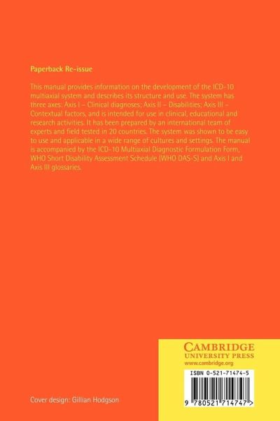 A simple and easy to use triaxial recording system intended for use in clinical, educational and research activities which aims to ensure that disabilities and factors relevant to the management of a mentally ill patient's condition are systematically recorded. It has been prepared and trialled by an international team of experts and has proven easy to use, helpful and applicable to a wide range of cultures and settings. This comprehensive manual provides information on the development of the ICD-10 multiaxial system and describes its structure and use. It details ICD-10 categories for each axis of the system as well as instruments and instructions for their application. The instruments include the ICD-10 multiaxial diagnostic formulation form, WHO short disability assessment schedule (WHO DAS-S) and Axis III checklist.