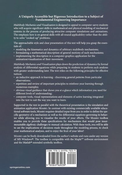 Multibody Mechanics and Visualization is designed to appeal to computer-savvy students who will acquire significant skills in mathematical and physical modelling of mechanical systems in the process of producing attractive computer simulations and animations. The emphasis here is on general skills with all-round applicability rather than the ability to solve "cooked-up" problems. The approachable style and clear presentation of this text will help you grasp the essentials of: modeling the kinematics and dynamics of arbitrary multibody mechanisms; formulating a mathematical description of general motions of such mechanisms; implementing the description in a computer-graphics application for the animation/visualization of the movement. Multibody Mechanics and Visualization plays down the prediction of dynamics by formal analysis of differential equations while preparing its students to perform such analyses with greater understanding later. The text relies on the following principles for effective tuition: an inductive approach to learning - discerning general patterns from particular observations; repetition and review of important principles to reinforce your learning through numerous examples; obvious visual guidance that shows you at a glance which information you need for different levels of understanding; computer tools, visual representations and elements of active learning integrated into the text to suit the way you want to learn. Supported in the text in parallel with the theoretical presentation is the simulation and animation application Mambo. In contrast with existing commercially available educational software tools, Mambo requires detailed input from you in order to define the specific geometry of a mechanism as well as the differential equations governing its behavior while allowing you to visualize the results of your efforts. The Mambo toolbox enables you to provide thesespecifications for mechanisms that would pose insurmountable algebraic challenges to manual calculation. With these tools, you will be able to see the implications of decisions made throughout the modeling process, to check your mathematical analyses, and to enjoy the fruit of your labor! Mambo can be freely downloaded from the author's website and runs under any version of MS Windows®. The toolbox is compatible with the Maple(TM) software environment and the Matlab® extended symbolic toolbox.