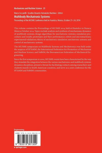 This volume contains the Proceedings of MUSME 2014, held at Huatulco in Oaxaca, Mexico, October 2014. Topics include analysis and synthesis of mechanisms; dynamics of multibody systems; design algorithms for mechatronic systems; simulation procedures and results; prototypes and their performance; robots and micromachines; experimental validations; theory of mechatronic simulation; mechatronic systems; and control of mechatronic systems.
