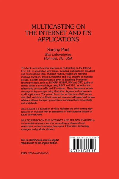 I Introduction to Multicast.- 1 Introduction.- 2 Multicasting Fundamentals.- II Network Layer Multicast.- 3 Multicast Routing Algorithms.- 4 IP Multicast.- 5 Multicast Extensions to Open Shortest Path First (MOSPF).- 6 Protocol Independent Multicast (PIM).- 7 Core-Based Tree (CBT).- 8 Ordered Core Based Tree (OCBT).- 9 Hierarchical DVMRP (H-DVMRP).- 10 Hierarchical PIM (HPIM).- 11 Border Gateway Multicast Protocol (BGMP).- 12 Multicast Backbone of the Internet (MBone).- 13 Programming with IP Multicast.- III Quality of Service.- 14 Integrated Services in the Internet and RSVP.- 15 Internet Stream Protocol - ST2.- IV Transport-layer issues.- 16 Real-Time Transport Protocol (RTP).- 17 Scalable Reliable Multicast (SRM).- 18 Reliable Multicast Transport Protocol (RMTP).- 19 Reliable Adaptive Multicast Protocol (RAMP).- 20 Reliable Multicast Protocol (RMP).- 21 Pros and cons of Reliable Multicast Protocols.- 22 Various Reliable Multicast Protocols.- 23 Forward Error Correction-based Reliable Multicast Protocols.- 24 Performance comparison of reliable multicast protocols.- V Video Multicast on the Internet.- 25 Scalable Feedback Control (SFC) for Multicast Video Distribution in the Internet.- 26 Receiver-driven Layered Multicast (RLM).- 27 Layered Video Multicast with Retransmission (LVMR).- 28 Destination Set Grouping (DSG).- VI Group Communication.- 29 Totem.- 30 Transis.- 31 Horus.- VII Multicasting in Asynchronous Transfer Mode (ATM).- 32 Multicast using ATM UNI 3.0/3.1.- 33 IP Multicast over ATM.- VIII Applications and Future of Multicasting.- 34 Multicast Applications.- 35 Future Directions.- Reference.