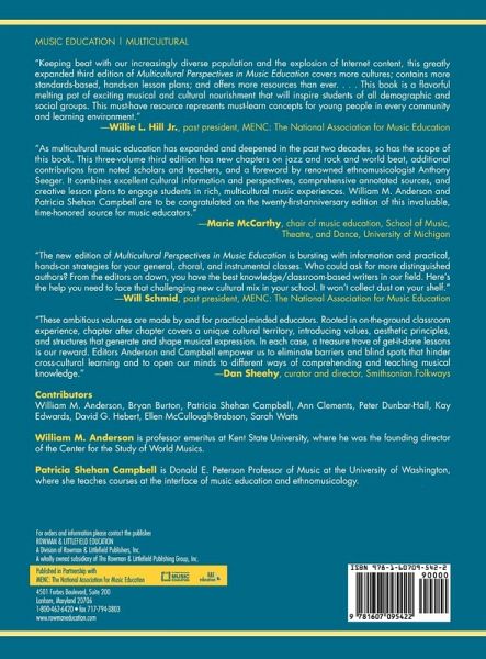 The new third edition of Multicultural Perspectives in Music Education is bursting with information and practical, hands-on strategies you can use in your general, choral and instrumental classes. Who could ask for more distinguished authors? From William M. Anderson and Patricia Shehan Campbell on down the list, you have the best knowledge/classroom-based writers in our field. These volumes provide the help you need to face that challenging new cultural mix in your school. They won't collect dust on your shelf. -- Will Schmid, past president, MENC: The National Association for Music Education These ambitious volumes are made by and for practical-minded educators. Accomplished, marquee-name leaders in culturally inclusive music education join with rising young stars of the field to craft a cornucopia of multicultural resources. Written in plain language and with authority born of on-the-ground classroom experience, chapter after chapter guides us into a unique cultural territory, introducing values, aesthetic principles, and structures that generate and shape musical expression. In each case, a treasure trove of get-it-done lessons is our reward. In their "Introduction," editors William M. Anderson and Patricia Shehan Campbell empower us to eliminate barriers and blind spots that hinder crosscultural learning and to open our minds to different ways of comprehending and teaching musical knowledge. More than ever, this third and expanded edition delivers on the promise of its title: Multicultural Perspectives in Music Education. -- Dan Sheehy, director, Smithsonian Global Sound Keeping beat with the increasingly diverse population of the United States and the explosion of internet content, the greatly expanded third edition of Multicultural Perspectives in Music Education covers more cultures, contains more standards-based, hands-on lesson plans, and offers more resources than ever. The newly amplified chapter on African American music and new chapters on jazz/rock and world-beat are all brimming with inspiring material, bringing these rich traditions to life. As studentsexperience the rhythms, sounds, and stories of the global community, they will learn how these musics have influenced both American culture and world cultures. Students may develop a deeper understanding of their own heritage, and see how they fit into the global community. This is especially important for young people who may be alienated due to ethnic or cultural differences as well as students who may feel lost amid the growing population in today's urban areas in our technological age. Pat Campbell,Bill Anderson and their colleagues have created a flavorful melting pot of exciting musical and cultural nourishment that will inspire students of all demographic and social groups. Multicultural Perspectives in Music Education is not only a must-h -- Willie L. Hill Jr., chair, MENC Society for Jazz Education As multicultural music education has expanded and deepened in the past two decades, so also has the scope of this book. Now appearing in its third edition as a three-volume set, there are new chapters on jazz and rock and world beat, additional contributions from noted scholars and teachers, and a foreword by renowned ethnomusicologist Anthony Seeger. The book is unique in its combination of excellent cultural information and perspectives, comprehensive annotated sources, and creative lesson plans designed to engage students in rich, multicultural music experiences. William M. Anderson and Patricia Shehan Campbell are to be congratulated on the twentieth anniversary edition of this invaluable, time-honored source for music educators. -- Marie McCarthy, chair of music education, School of Music, Theatre and Dance, University of Michigan Keeping beat with the increasingly diverse population of the United States and the explosion of internet content, the greatly expanded third edition of Multicultural Perspectives in Music Education covers more cultures, contains more standards-based, hands-on lesson plans, and offers more resources than ever. The newly amplified chapter on African American music and new chapters on jazz/rock and world-beat are all brimming with inspiring material, bringing these rich traditions to life. As students experience the rhythms, sounds, and stories of the global community, they will learn how these musics have influenced both American culture and world cultures. Students may develop a deeper understanding of their own heritage, and see how they fit into the global community. This is especially important for young people who may be alienated due to ethnic or cultural differences as well as students who may feel lost amid the growing population in today's urban areas in our technological age. Pat Campbell, Bill Anderson and their colleagues have created a flavorful melting pot of exciting musical and cultural nourishment that will inspire students of all demographic and social groups. Multicultural Perspectives in Music Education is not only a must-have resource for all music education classrooms; it represents must-learn concepts for young people in every community and learning environment. -- Willie L. Hill Jr., chair, MENC Society for Jazz Education