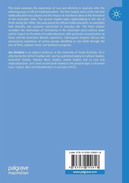 This book examines the experience of race and ethnicity in Australia after the withering away of official multiculturalism. The first chapter looks at the formation of the Australian state, the role that multiculturalism has played, and the impact of neoliberal ideas. The second chapter takes nightclubbing in the city of Perth during the 1980s, the peak period for official multiculturalism, to exemplify how diversity and exclusion functioned in everyday life. The third chapter considers the imbrication of Christianity in the Australian socio-cultural order and its impact on the limits of multiculturalism with particular concentration on Islam and the Australian Muslim experience. Subsequent chapters discuss the exclusionary experience of various groups identified as non-white through the lens of films, popular music and television programs.