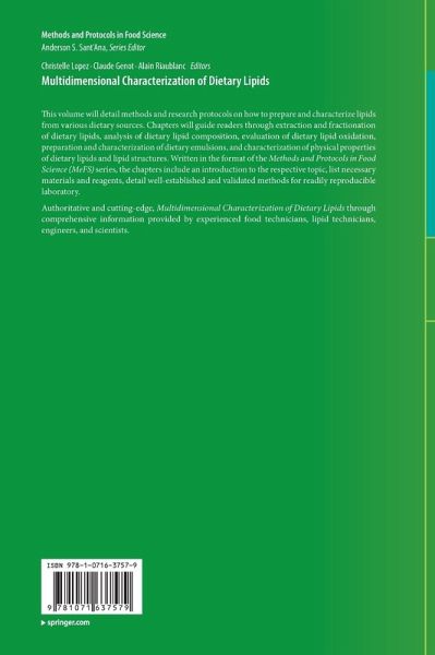 Cold-extraction of total lipids from biological materials and food matrices with mixtures of polar and apolar solvents.- Separation of lipid classes by solid phase extraction for subsequent analysis.- Purification of lipids by cold acetone precipitation.- Stripping of vegetable oils by direct mixing with adsorbent materials.- Preparation of fatty acid derivatives for their further analysis and quantification by gas chromatography.- Gas chromatography analysis of fatty acids derivatives.- Analysis of neutral lipids, phospholipids, glycolipids and total lipids by High-Performance Thin Layer Chromatography (HPTLC).- HPLC analysis of triacylglycerol molecular species.- Identification and quantification of phospholipids by HPLC/ELSD : application to bovine milk phospholipids.- Quantification of tocopherols and tocotrienols (tocols) in oils, fats and food products by HPLC-fluorescence (FLD).- Dietary Carotenoid : Identification and quantification.- Quantification of conjugated dienes in oxidizing oils and emulsions.- Quantification of hydroperoxides in oils and fats, oil-in-water emulsions and food products by ferrous oxidation-xylenol orange method.- Measurement of peroxide values (PV) in oils by triphenylphosphine/triphenylphosphine oxide (TPP/TPPO) assay coupled with FTIR-ATR spectroscopy.- Method for quantifying oxidized fatty acids in food samples using ultra-high pressure liquid chromatography tandem mass spectrometry.- Quantitative 1H NMR analysis of food lipid hydroperoxides and aldehydes.- Quantification of secondary lipid oxidation products in oils, fats and food products: malondialdehyde by HPLC-DAD and TBA-RS by UV-visible spectrophotometry.- Analysis of secondary volatile oxidation products by headspace GC-MS techniques.- LC-MS/MS analysis of Isoprostanoids in edible oils, vegetable and animal.- Preparation of dietary lipid emulsions using laboratory methods.- Particle size distribution of dietary lipid assemblies.- Surface load and interfacial compositionof protein-stabilized O/W emulsions.- The thermal properties of dietary lipids investigated by differential scanning calorimetry.- The crystallization properties of dietary lipids characterised by X-ray diffraction.- Rheological characterization of butter samples by a lubricated squeezing flow.- Observation of dietary lipids by microscopy techniques.