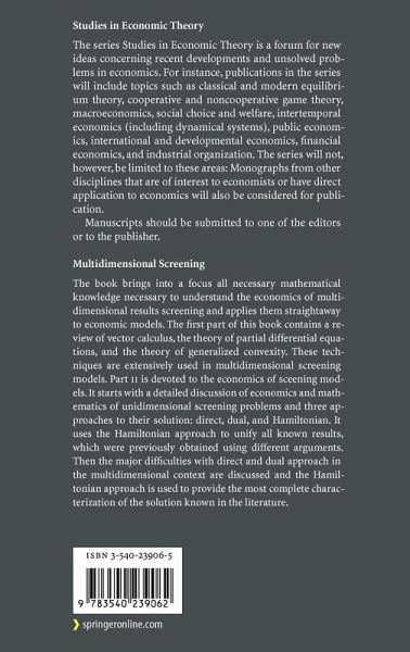 The book brings into a focus all necessary mathematical knowledge necessary to understand the economics of multidimensional results screening and applies them straightaway to economic models. The first part of this book contains a review of vector calculus, the theory of partial differential equations, and the theory of generalized convexity. These techniques are extensively used in multidimensional screening models. Part II is devoted to the economics of sceening models. It starts with a detailed discussion of economics and mathematics of unidimensional screening problems and three approaches to their solution: direct, dual, and Hamiltonian. It uses the Hamiltonian approach to unify all known results, which were previously obtained using different arguments. Then the major difficulties with direct and dual approach in the multidimensional context are discussed and the Hamiltonian approach is used to provide the most complete characterization of the solution known in the literature.