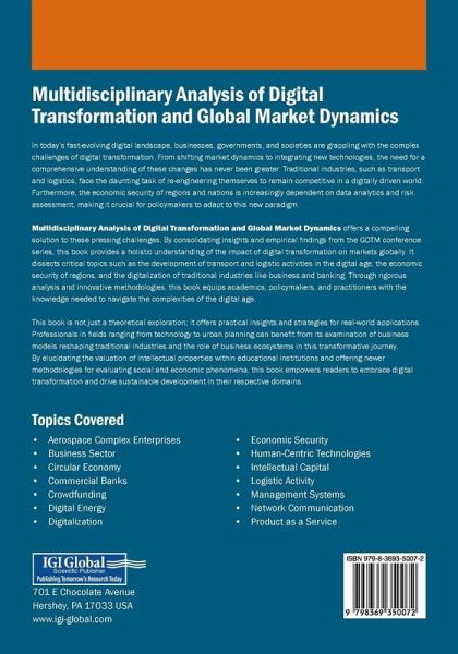 In today's fast-evolving digital landscape, businesses, governments, and societies are grappling with the complex challenges of digital transformation. From shifting market dynamics to integrating new technologies, the need for a comprehensive understanding of these changes has never been greater. Traditional industries, such as transport and logistics, face the daunting task of re-engineering themselves to remain competitive in a digitally driven world. Furthermore, the economic security of regions and nations is increasingly dependent on data analytics and risk assessment, making it crucial for policymakers to adapt to this new paradigm. Multidisciplinary Analysis of Digital Transformation and Global Market Dynamics offers a compelling solution to these pressing challenges. By consolidating insights and empirical findings from the GDTM conference series, this book provides a holistic understanding of the impact of digital transformation on markets globally. It dissects critical topics such as the development of transport and logistic activities in the digital age, the economic security of regions, and the digitalization of traditional industries like business and banking. Professionals in fields ranging from technology to urban planning can benefit from its examination of business models reshaping traditional industries and the role of business ecosystems in this transformative journey.