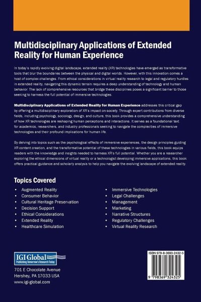 In today's rapidly evolving digital landscape, extended reality (XR) technologies have emerged as transformative tools that blur the boundaries between the physical and digital worlds. However, with this innovation comes a host of complex challenges. From ethical considerations in virtual reality research to legal and regulatory hurdles in extended reality, navigating this dynamic terrain requires a deep understanding of technology and human behavior. The lack of comprehensive resources that bridge these disciplines poses a significant barrier to those seeking to harness the full potential of immersive technologies. Multidisciplinary Applications of Extended Reality for Human Experience addresses this critical gap by offering a multidisciplinary exploration of XR's impact on society. Through expert contributions from diverse fields, including psychology, sociology, design, and culture, this book provides a comprehensive understanding of how XR technologies are reshaping human perceptions and interactions. It serves as a foundational text for academics, researchers, and industry professionals seeking to navigate the complexities of immersive technologies and their profound implications for human life.