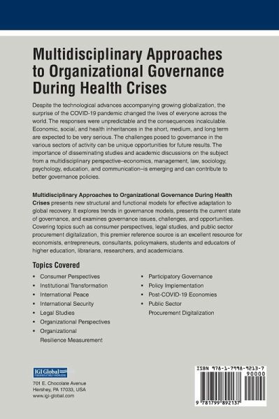 Despite the technological advances accompanying growing globalization, the surprise of the COVID-19 pandemic changed the lives of everyone across the world. The responses were unpredictable and the consequences incalculable. Economic, social, and health inheritances in the short, medium, and long term are expected to be very serious. The challenges posed to governance in the various sectors of activity can be unique opportunities for future results. The importance of disseminating studies and academic discussions on the subject from a multidisciplinary perspective-economics, management, law, sociology, psychology, education, and communication-is emerging and can contribute to better governance policies. Multidisciplinary Approaches to Organizational Governance During Health Crises presents new structural and functional models for effective adaptation to global recovery. It explores trends in governance models, presents the current state of governance, and examines governance issues, challenges, and opportunities. Covering topics such as consumer perspectives, legal studies, and public sector procurement digitalization, this premier reference source is an excellent resource for economists, entrepreneurs, consultants, policymakers, students and educators of higher education, librarians, researchers, and academicians.