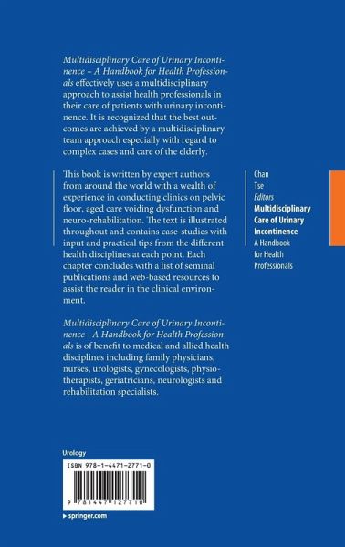 Multidisciplinary Care of Urinary Incontinence - a Handbook for Health Professionals is of benefit to medical and allied health disciplines including family physicians, nurses, urologists, gynecologists, physiotherapists, geriatricians, neurologists and rehabilitation specialists.