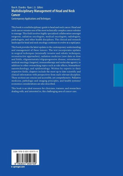 This book is a multidisciplinary guide to head and neck cancer.Head and neck cancer remains one of the most technically complex cancer subsites to manage. This field involves highly specialized, multidisciplinary management and collaboration amongst surgeons, radiation oncologists, medical oncologists, radiologists, pathologists, and other health disciplines. The clinical and research landscape for head and neck oncology continues to evolve at a rapid pace.