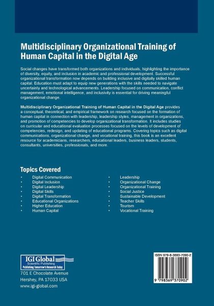 Social changes have transformed both organizations and individuals, highlighting the importance of diversity, equity, and inclusion in academic and professional development. Successful organizational transformation now depends on building inclusive and digitally skilled human capital. Education must adapt to equip new generations with the skills needed to navigate uncertainty and technological advancements. Leadership focused on communication, conflict management, emotional intelligence, and inclusivity is essential for driving meaningful organizational change. Multidisciplinary Organizational Training of Human Capital in the Digital Age provides a conceptual, theoretical, and empirical framework on research focused on the formation of human capital in connection with leadership, leadership styles, management in organizations, and promotion of competencies to develop organizational transformation. It includes studies on curricular and educational evaluation processes focused on the levels of development of competencies, redesign, and updating of educational programs. Covering topics such as digital communications, organizational change, and vocational training, this book is an excellent resource for academicians, researchers, educational leaders, business leaders, students, consultants, universities, professionals, and more.