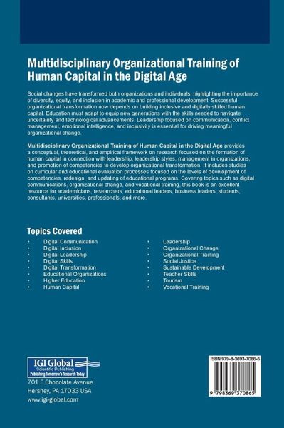 Social changes have transformed both organizations and individuals, highlighting the importance of diversity, equity, and inclusion in academic and professional development. Successful organizational transformation now depends on building inclusive and digitally skilled human capital. Education must adapt to equip new generations with the skills needed to navigate uncertainty and technological advancements. Leadership focused on communication, conflict management, emotional intelligence, and inclusivity is essential for driving meaningful organizational change. Multidisciplinary Organizational Training of Human Capital in the Digital Age provides a conceptual, theoretical, and empirical framework on research focused on the formation of human capital in connection with leadership, leadership styles, management in organizations, and promotion of competencies to develop organizational transformation. It includes studies on curricular and educational evaluation processes focused on the levels of development of competencies, redesign, and updating of educational programs. Covering topics such as digital communications, organizational change, and vocational training, this book is an excellent resource for academicians, researchers, educational leaders, business leaders, students, consultants, universities, professionals, and more.
