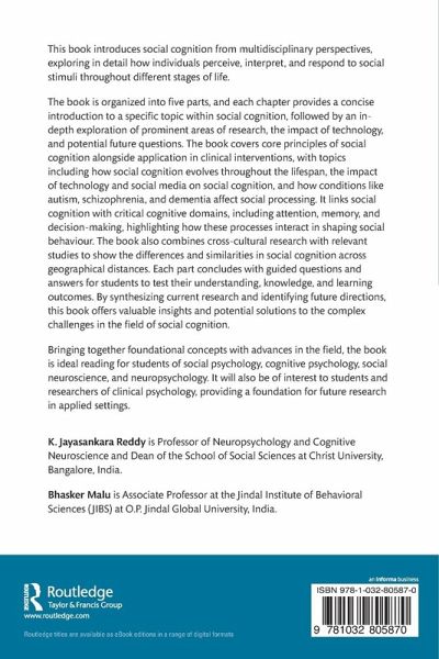 Part 1: What Is Social Cognition and How Is It Studied? 1. Social Cognition and Its Emergence 2. Methods, Procedures, Latest Trends in Social Cognition Research Part 1: Guided Questions and Answers Part 2: Cognitive Perspective: How Cognition Processes Social Situations 3. Attention and Perception in the Social Cognition 4. Affect Motivation and Behaviour 5. Memory, Learning, and Language in the Social Cognition 6. Applied Decision-Making 7. Information Processing and Social Media Part 2: Guided Questions and Answers Part 3: Social Perspective: Cognition Underpinning Social Behaviour 8. Social Cognition and Attitude, and Attribution 9. Prejudice and Stereotype 10. Theory of Mind, Self and Others 11. Social Perceptions and the Online World 12. Understanding Cross-Cultural Perspective in Social Cognition Part 3: Guided Questions and Answers Part 4: Social Cognition Across the Lifespan and Clinical Presentation 13. Social Cognition in Early Years - Infancy and Adolescence 14. Social Cognition and Ageing 15. Impact of Technology on Lifespan Development 16. Social Cognition in Clinical Disorders Part 4: Guided Questions and Answers Part 5: Applications 17. Interventions using Social Cognition 18. Application on the Social World - Design thinking, UX/UI research, Digital Communication 19. Rehabilitation: Improving Social Cognitive Skills Part 5: Guided Questions and Answers