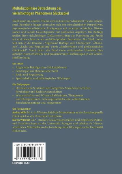 Wohl kaum ein anderes Thema wird so kontrovers diskutiert wie das Glücksspiel. Rechtliche Fragen vermischen sich mit wirtschaftlichen Perspektiven, psychologisch-medizinische Erwägungen mit moralisch-ethischen Diskussionen und soziale Gesichtspunkte mit politischen Aspekten. Die Beiträge greifen diese vielschichtigen Diskussionsstränge aus Forschung und Praxis auf und beleuchten sie aus multidisziplinärer Perspektive. Das Werk unterteilt sich in die Bereiche "Allgemeine Beiträge zum Glücksspiel", "Ökonomie", "Recht und Regulierung" sowie "Spielverhalten und problematisches Glücksspiel". Somit liefert der Band einen umfassenden Überblick über aktuelle wissenschaftliche und praxisrelevante Problemlagen in der Glücksspielforschung.