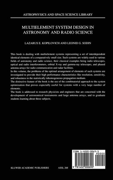 The multielement systems have been widely used in many fields of astron omy and radio science in the last decades. This is caused by the increasing demands on the resolution and sensitivity of such systems over the wide range of the electromagnetic wavelengths, from gamma up to radio. The ground-based optical and radio interferometers, gamma-ray and X-ray or bital telescopes, antenna arrays of radio telescopes and also some other radio devices belong to scientific instruments using multielement systems. There fore, the current problems of the optimal construction of such systems, or precisely, those of searching for the best arrangement of the elements in them, were formulated. A rather large number of scientific papers, including those of the authors, is devoted to these problems, and we believe that the time has come to integrate the basic results of the papers into the mono graph. The offered book consists of three parts. The first part is concerned with the optimal synthesis of optical and radio interferometers of various types and purposes; the synthesis of non-equidistant antenna arrays is con sidered in the second part; and the methods for the construction of coded masks for X-ray and gamma-ray orbital telescopes are expounded in the third one. Since in the text combinatorial constructions which are little known to astronomers are used, the necessary information is given in the appendices. Various tables containing the parameters of the systems consid ered are also represented.