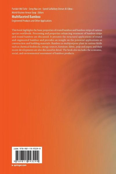 This book highlights the basic properties of round bamboo and bamboo strips of various species worldwide. Processing and properties enhancing treatment of bamboo strips and round bamboo are discussed. It presents the structural applications of round and engineered bamboo and provides an insight on the potential applications as construction and building materials. Bamboo as multipurpose plant in various fields such as chemical feedstocks, energy sources, furniture, fabric, pulp and paper, and their recent developments are also discussed in detail. The book also includes the economic, social, and environmental assessment of bamboo products.…mehr