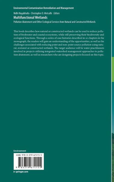 Chapter 1. Multifunctional Wetlands: An Overview of Pollution Abatement by Natural and Constructed Wetland Ecosystems.- Chapter 2. Using Natural Wetlands for Municipal Effluent Assimilation: A Half-Century of Experience for the Mississippi Delta and Surrounding Environs.- Chapter 3. The Use of Natural Tundra Wetlands to Treat Domestic Wastewater in Canada's Far North.- Chapter 4. The Long-term Use of Treatment Wetlands for Total Phosphorus Removal: Can Performance Be Rejuvenated with Adaptive Management?.- Chapter 5. An Investment Strategy for Reducing Disaster Risks and Coastal Pollution Using Nature Based Solutions.- Chapter 6. The Role of Constructed Wetlands in Creating Water Sensitive Cities.- Chapter 7. Methylmercury in Managed Wetlands.- Chapter 8. Growing Ornamental Flowers and Fish in Indigenous Communities in Mexico: An Incentive Model for Pollution Abatement Using Constructed Wetlands.- Chapter 9. Phytoremediation Eco-Models Using Indigenous Macrophytes and Phytomat