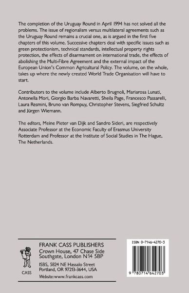 The completion of the Uruguay Round in April 1994 has not solved all the problems. The issue of regionalism versus multilateral agreements such as the Uruguay Round remains a crucial one, as is argued in the first five chapters of this volume. Successive chapters deal with specific issues such as green protectionism, technical standards, intellectual property rights protection, the effects of disarmament on international trade, the effects of abolishing the Multi-fibre Agreement and the external impact of the European Union's Common Agricultural Policy. The volume, on the whole, takes up where the newly created World Trade Organization will have to start.