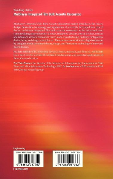 Mulilayer Integrated Film Bulk Acoustic Resonators mainly introduces the theory, design, fabrication technology and application of a recently developed new type of device, multilayer integrated film bulk acoustic resonators, at the micro and nano scale involving microelectronic devices, integrated circuits, optical devices, sensors and actuators, acoustic resonators, micro-nano manufacturing, multilayer integration, device theory and design principles, etc. These devices can work at very high frequencies by using the newly developed theory, design, and fabrication technology of nano and micro devices.