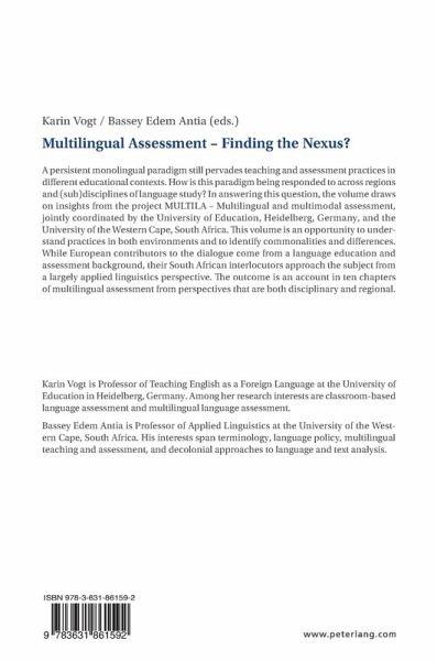 Karin Vogt, Bassey E. Antia: Multilingual assessment - Finding the nexus? - Bassey E. Antia: Multilingual assessment: The Global South as locus of enunciation - Karin Vogt: Teaching and assessing (foreign) languages in multilingual contexts - A European contextualization - Susan Coetzee- Van Rooy: Students' multilingual repertoires at a South African university: Implications for conceptualizing multilingualism in assessment - Eleni Meletiadou: Using translanguaging and English as a Lingua Franca to promote an inclusive multilingual approach towards comprehension in assessment in Higher Educational Institutions in the UK - Kabelo Sebolai, Darlington Mutakwa: A multilingual student population taking a test of academic literacy in English: Implications for test fairness - Siphokazi Magadla, Zikho Dana, Dion Nkomo: Multilingual teaching and assessment: Towards an endogenous Political and International Studies at a South African university - Gudrun Erickson: Assessing languages in a multilingual context - Reflections from a Swedish perspective - Maria Stathopoulou, Magdalini Liontou, Phyllisienne Gauci, Sílvia Melo- Pfeifer: Assessing cross- linguistic mediation: Insights from the METLA project - Viktoriia Osidak, Maryana Natsiuk: Towards 21st century multilingualism in Ukraine: The present landscape - Carmen Konzett- Firth, Anastasia Drackert, Wolfgang Stadler, Judith Visser: Same educational standards, same assessment needs? The professional development needs of teachers of French, Italian, and Spanish in the area of language assessment - Dina Tsagari, Karin Vogt: Foreign language learning, teaching and assessment in multilingual contexts - In conversation with Dina Tsagari - List of contributors.