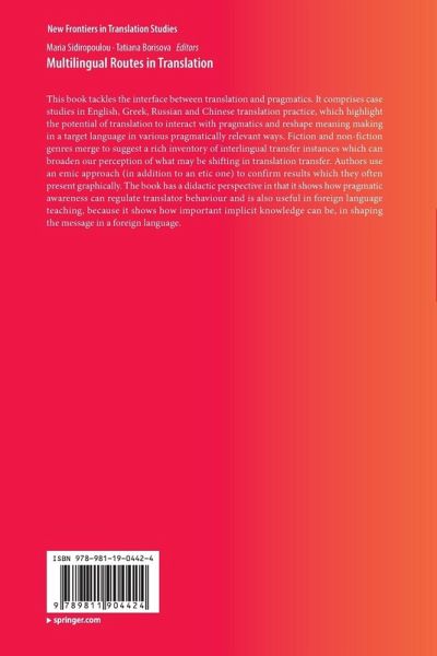 This book tackles the interface between translation and pragmatics. It comprises case studies in English, Greek, Russian and Chinese translation practice, which highlight the potential of translation to interact with pragmatics and reshape meaning making in a target language in various pragmatically relevant ways. Fiction and non-fiction genres merge to suggest a rich inventory of interlingual transfer instances which can broaden our perception of what may be shifting in translation transfer. Authors use an emic approach (in addition to an etic one) to confirm results which they often present graphically. The book has a didactic perspective in that it shows how pragmatic awareness can regulate translator behaviour and is also useful in foreign language teaching, because it shows how important implicit knowledge can be, in shaping the message in a foreign language.
