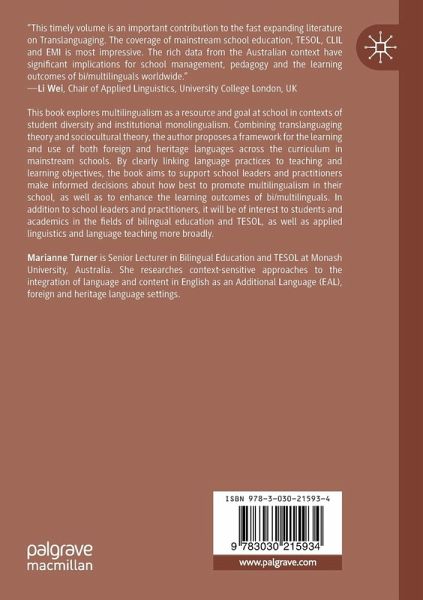 This book explores multilingualism as a resource and goal at school in contexts of student diversity and institutional monolingualism. Combining translanguaging theory and sociocultural theory, the author proposes a framework for the learning and use of both foreign and heritage languages across the curriculum in mainstream schools. By clearly linking language practices to teaching and learning objectives, the book aims to support school leaders and practitioners make informed decisions about how best to promote multilingualism in their school, as well as to enhance the learning outcomes of bi/multilinguals. In addition to school leaders and practitioners, it will be of interest to students and academics in the fields of bilingual education and TESOL, as well as applied linguistics and language teaching more broadly.