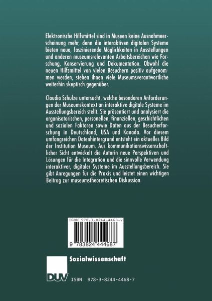 Aus kommunikationswissenschaftlicher Sicht entwickelt Claudia Schulze neue Perspektiven und Lösungen für die Integration und die sinnvolle Verwendung interaktiver, digitaler Systeme im Ausstellungsbereich. Sie gibt Anregungen für die Praxis und leistet einen wichtigen Beitrag zur museumstheoretischen Diskussion.
