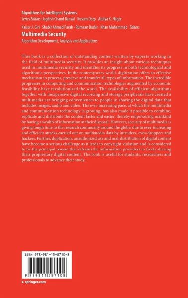 This book is a collection of outstanding content written by experts working in the field of multimedia security. It provides an insight about various techniques used in multimedia security and identifies its progress in both technological and algorithmic perspectives. In the contemporary world, digitization offers an effective mechanism to process, preserve and transfer all types of information. The incredible progresses in computing and communication technologies augmented by economic feasibility have revolutionized the world. The availability of efficient algorithms together with inexpensive digital recording and storage peripherals have created a multimedia era bringing conveniences to people in sharing the digital data that includes images, audio and video. The ever-increasing pace, at which the multimedia and communication technology is growing, has also made it possible to combine, replicate and distribute the content faster and easier, thereby empowering mankind by having awealth of information at their disposal. However, security of multimedia is giving tough time to the research community around the globe, due to ever-increasing and efficient attacks carried out on multimedia data by intruders, eves-droppers and hackers. Further, duplication, unauthorized use and mal-distribution of digital content have become a serious challenge as it leads to copyright violation and is considered to be the principal reason that refrains the information providers in freely sharing their proprietary digital content. The book is useful for students, researchers and professionals to advance their study.