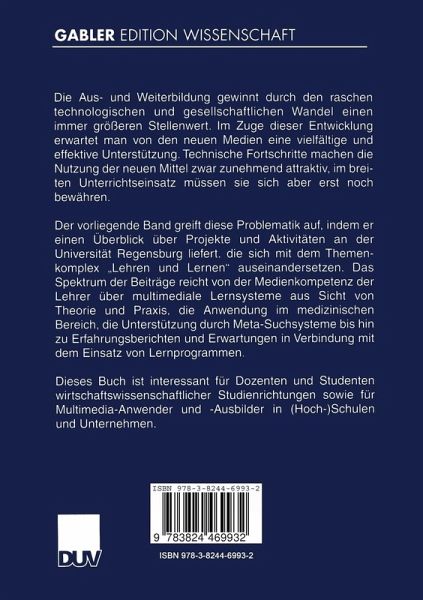 Die Aus- und Weiterbildung gewinnt durch den raschen technologischen und gesellschaftlichen Wandel einen immer größeren Stellenwert. Im Zuge dieser Entwicklung erwartet man von den neuen Medien eine vielfältige und effektive Unterstützung. Technische Fortschritte machen die Nutzung der neuen Mittel zwar zunehmend attraktiv, im breiten Unterrichtseinsatz müssen sie sich aber erst noch bewähren. Der vorliegende Band greift diese Problematik auf, indem er einen Überblick über Projekte und Aktivitäten an der Universität Regensburg liefert, die sich mit dem Themenkomplex "Lehren und Lernen" auseinandersetzen. Das Spektrum der Beiträge reicht von der Medienkompetenz der Lehrer über multimediale Lernsysteme aus Sicht von Theorie und Praxis, die Anwendung im medizinischen Bereich, die Unterstützung durch Meta-Suchsysteme bis hin zu Erfahrungsberichten und Erwartungen in Verbindung mit dem Einsatz von Lernprogrammen.