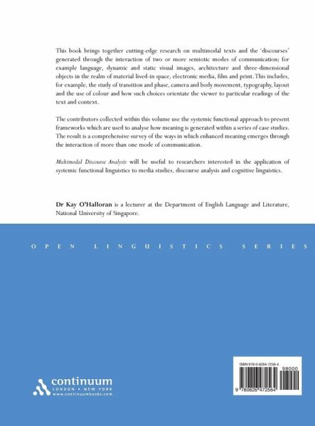 This book brings together cutting-edge research on multimodal texts and the "discourses" generated through the interaction of two or more modes of communication, for example pictures of language, typography and layout, body movement and camera movement. The contributors collected within this volume use systemic functional linguistics to analyze how meaning is generated within a series of case studies. The result is a comprehensive survey of the ways in which enhanced meaning emerges through the interaction of more than one mode of communication. Multimodal Discourse Analysis will be useful to researchers interested in the application of systemic functional linguistics to media studies, discourse analysis and cognitive linguistics.