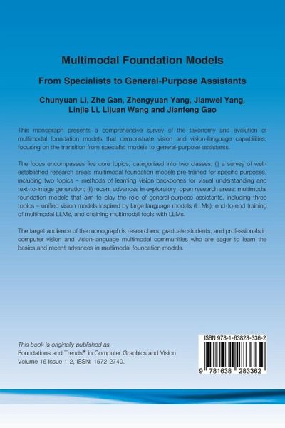This monograph presents a comprehensive survey of the taxonomy and evolution of multimodal foundation models that demonstrate vision and vision-language capabilities, focusing on the transition from specialist models to general-purpose assistants. The focus encompasses five core topics, categorized into two classes; (i) a survey of well-established research areas: multimodal foundation models pre-trained for specific purposes, including two topics - methods of learning vision backbones for visual understanding and text-to-image generation; (ii) recent advances in exploratory, open research areas: multimodal foundation models that aim to play the role of general-purpose assistants, including three topics - unified vision models inspired by large language models (LLMs), end-to-end training of multimodal LLMs, and chaining multimodal tools with LLMs. The target audience of the monograph is researchers, graduate students, and professionals in computer vision and vision-language multimodal communities who are eager to learn the basics and recent advances in multimodal foundation models.