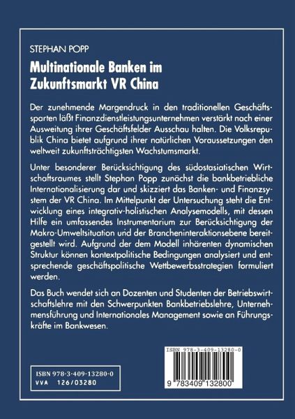 Der zunehmende Margendruck in den traditionellen Geschäftssparten läßt Finanzdienstleistungsunternehmen verstärkt nach einer Ausweitung ihrer Geschäftsfelder Ausschau halten. Die Volksrepublik China bietet aufgrund ihrer natürlichen Voraussetzungen den weltweit zukunftsträchtigsten Wachstumsmarkt. Unter besonderer Berücksichtigung des südostasiatischen Wirtschaftsraumes stellt Stephan Popp zunächst die bankbetriebliche Internationalisierung dar und skizziert das Banken- und Finanzsystem der VR C hina. Im Mittelpunkt der Untersuchung steht die Entwicklung eines integrativ-holistischen Instrumentarium zur Berücksichtigung der Makro-Umweltsituation und der Brancheninteraktionsebene bereitgestellt wird. Verzeichnis: Unter Berücksichtigung des südostasiatischen Wirtschaftsraumes stellt Stephan Popp die bankbetriebliche Internationalisierung dar und skizziert das Banken- und Finanzsystem der VR China. Der Autor entwickelt ein integrativ-holistisches Analysemodell, mit dessen Hilfe ein umfassendes Instrumentarium zur Berücksichtigung der Makro-Umweltsituation und der Brancheninteraktionsebene bereitgestellt wird.