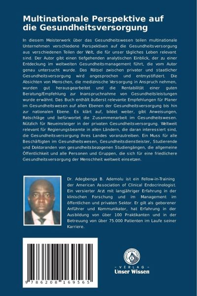 In diesem Meisterwerk über das Gesundheitswesen teilen multinationale Unternehmen verschiedene Perspektiven auf die Gesundheitsversorgung aus verschiedenen Teilen der Welt, die für unser tägliches Leben relevant sind. Der Autor gibt einen tiefgehenden analytischen Einblick, der zu einer Entdeckung im weltweiten Gesundheitsmanagement führt, die vom Autor genau untersucht wurde. Das Rätsel zwischen privater und staatlicher Gesundheitsversorgung wird angesprochen und entmystifiziert. Die Absichten von Menschen, die medizinische Versorgung in Anspruch nehmen, wurden gut herausgearbeitet und die Rentabilität einer guten Beratung/Empfehlung zur Inanspruchnahme von Gesundheitsleistungen wurde erwähnt. Das Buch enthält äußerst relevante Empfehlungen für Planer im Gesundheitswesen auf allen Ebenen der Gesundheitsversorgung bis hin zur nationalen Ebene. Es klärt auf, bildet weiter, gibt Anweisungen, Ratschläge und befürwortet die Zusammenarbeit im Gesundheitswesen. Nützlich für Neueinsteiger in der privaten Gesundheitsversorgung. Weltweit relevant für Regierungsbeamte in allen Ländern, die daran interessiert sind, die Gesundheitsversorgung ihres Landes voranzutreiben. Ein Muss für alle Beschäftigten im Gesundheitswesen, Gesundheitsdienstleister, Studierende und Doktoranden von gesundheitsbezogenen Studiengängen, die allgemeine Öffentlichkeit und alle Personen und Gruppen, die sich für eine friedlichere Gesundheitsversorgung der Menschheit weltweit einsetzen.