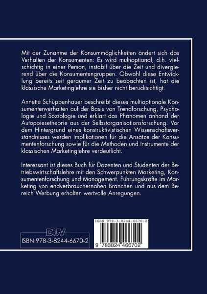 Mit der Zunahme der Konsummöglichkeiten ändert sich das Verhalten der Konsumenten: Es wird multioptional, d.h. vielschichtig in einer Person, instabil über die Zeit und divergierend über die Konsumentengruppen. Obwohl diese Entwicklung bereits seit geraumer Zeit zu beobachten ist, hat die klassische Marketinglehre sie bisher nicht berücksichtigt. Annette Schüppenhauer beschreibt dieses multioptionale Konsumentenverhalten auf der Basis von Trendforschung, Psychologie und Soziologie und erklärt das Phänomen anhand der Autopoiesetheorie aus der Selbstorganisationsforschung. Vor dem Hintergrund eines konstruktivistischen Wissenschaftsverständnisses werden Implikationen für die Ansätze der Konsumentenforschung sowie für die Methoden und Instrumente der klassischen Marketinglehre verdeutlicht.