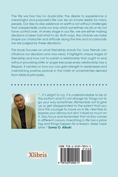 The life we live has no duplicate; the desire to experience a meaningful and purposeful life can be an innate desire for many people. Our day-to-day existence on earth is not without challenges that unexpectedly come our way which sometimes we do or do not have control over. At every stage in our life, we are either making decisions or been told what to do. Both ways, the choices we make shape our character and attitude along the line and occasionally we are judged by these decisions. This book focuses on what friendship stands for, how friends can influence our decisions and vice versa. It highlights unique stages of friendship and how not to sustain a relationship that ought to end without provoking strife or anger because every relationship has a lifespan. It centers on how you can gain strength in weaknesses and maintaining positive posture in the midst of uncertainties derived from biblical principles.
