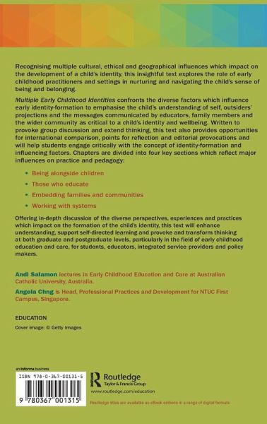 Recognising multiple cultural, ethical and geographical influences which impact on the development of a child's identity, this insightful text explores the role of early childhood practitioners and settings in nurturing and navigating the child's sense of being and belonging. ¿ Multiple Early Childhood Identies confronts the diverse factors which influence early identity-formation to emphasise the child's understanding of self, outsiders' projections and the messages communicated by educators, family members and the wider community as critical to a child's identity and wellbeing. Written to provoke group discussion and extend thinking, this text also provides opportunities for international comparison, points for reflection and editorial provocations and will help students engage critically with the concept of identity-formation and influencing factors. Chapters are divided into four key sections which reflect major influences on practice and pedagogy: ¿ Being alongside children Those who educate Embedding families and communities Working with systems ¿ Offering in-depth discussion of the diverse perspectives, experiences and practices which impact on the formation of the child's identity, this text will enhance understanding, support self-directed learning and provoke and transform thinking at both graduate and postgraduate levels, particularly in the field of early childhood education and care, for students, educators, integrated service providers and policy makers.