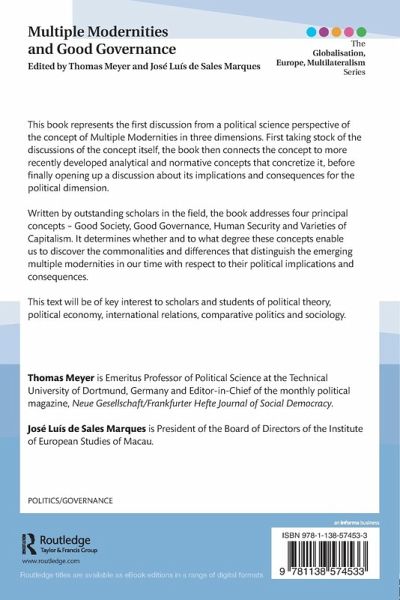 This book represents the first discussion from a political science perspective of the concept of Multiple Modernities in three dimensions. First taking stock of the discussions of the concept itself, the book then connects the concept to more recently developed analytical and normative concepts that concretize it, before finally opening up a discussion about its implications and consequences for the political dimension. Written by outstanding scholars in the field, the book addresses four principal concepts - Good Society, Good Governance, Human Security and Varieties of Capitalism. It determines whether and to what degree these concepts enable us to discover the commonalities and differences that distinguish the emerging multiple modernities in our time with respect to their political implications and consequences. This text will be of key interest to scholars and students of political theory, political economy, international relations, comparative politics and sociology.