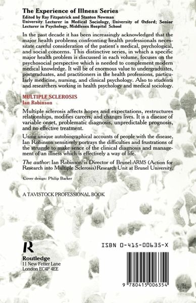 Multiple Sclerosis affects hopes and expectations, restructures relationships, modifies careers and changes lives. It is a disease of variable onset, problematic diagnosis, unpredicatable prognosis and no effective treatment. Using unique autobiographical accounts of people with the disease, Ian Robinson sensitively portrays the difficulties and frustrations of the struggle to make sense of the clinical diagnosis and management of an illness which is effectively a way of life.