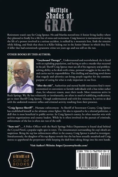 Multiple shades of Grey This book is a work of fiction. Names of characters and incidents are the product of the author's imagination or are used fictitiously and any resemblance to any actual persons, living or dead is entirely coincidental. Retirement wasn't easy for Craig Spence. He and Martha moved into A Senior living facility where they planned to finally live a life free of stress and excitement. Craig however is instrumental in saving the life of a person involved in a serious accident, is stalked by a mountain lion, finds the remains while hiking and finds that there is a Killer hiding out in the Senior Manor in which they live. A killer that had committed a gruesome crime ten years ago and was still on the run. OTHER BOOKS BY THIS AUTHOR: "Greyhound Therapy"_ Undermanned and overwhelmed, the is faced with an exploding population, and having to solve a murder that occurred in his jail. Sheriff Craig Spence must use all of his ingenuity and problem-solving ability as he deals with crime, personal struggles in his own life, and carrying out his responsibilities. This thrilling and touching novel shows that tragedy and adversity can bring people together in a common purpose of caring for what is truly important in our lives. "After the ride"_ Authorities and mental health institutions find it more economical or convenient to furnish individuals a bus ticket rather than, for whatever reason, meet their needs. Most transients that arrive in rock Springs. Wy. By bus voluntarily or involuntarily, are often in need of stabilizing medications, get to meet Sheriff Craig Spence. Though undermanned and with few resources, he strives to deal with the undesired transient influx and criminal activity resulting from their presence. "Craig Spence Sheriff"_ Humane enforcement: As Sheriff of Sweetwater County, Craig Spence has established himself as the ultimate crime fighter. He also is reputed to be a shrewd politician, a sill that is most beneficial in public service. In craig Spence's county ,he often matches wits with activist organizations and county leaders. While he is often involved in the pursuit of criminals, enforcement of the law is often not run of the mill. "Sum-mit": _ A Police Officer with the rock Springs Police Department is found dead behind the Crystal Pistol, a popular night spot in town. The circumstances surrounding the cops death are suspicious. Being the top law enforcement officer in the county, Craig Spence is asked to investigate. Simultaneously, the daughter of his top deputy reveals that she has sexually assaulted and craig moves to apprehend the perpetrator while keeping the dad from taking things into his own hands.