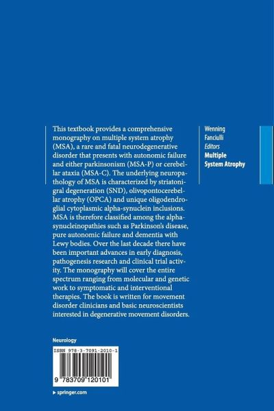 This textbook provides a comprehensive monography on multiple system atrophy (MSA), a rare and fatal neurodegenerative disorder that presents with autonomic failure and either parkinsonism (MSA-P) or cerebellar ataxia (MSA-C).The underlying neuropathology of MSA is characterized by striatonigral degeneration (SND), olivopontocerebellar atrophy (OPCA) and unique oligodendroglial cytoplasmic alpha-synuclein inclusions. MSA is therefore classified among the alpha-synucleinopathies such as Parkinson`s disease, pure autonomic failure and dementia with Lewy bodies. Over the last decade there have been important advances in early diagnosis, pathogenesis research and clinical trial activity. The monography will cover the entire spectrum ranging from molecular and genetic work to symptomatic and interventional therapies. The book is written for movement disorder clinicians and basic neuroscientists interested in degenerative movement disorders.
