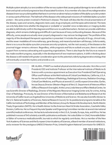 Multiple system atrophy is a rare condition of the nervous system that causes gradual damage to nerve cells in the brain and spinal cord and progressive loss of associated functions. It is a member of a class of neurodegenerative diseases known as synucleinopathies that have in common an abnormal accumulation of the alpha-synuclein protein in various parts of the brain. The hallmark of the disease is the widespread inclusions of misfolded alpha-synuclein protein - the same protein involved in Parkinson's disease. This book will describe the clinical presentations of the disease, types and variants, diagnostic tests used, drugs employed, and therapies administered. The tests can only help determine whether the diagnosis is 'probable' or 'possible' since no laboratory or imaging studies are able to definitively confirm the diagnosis and there are no useful biomarkers. No test can provide a definitive diagnosis, which remains challenging and difficult in part because of many confounding diseases. Because of this difficulty, some people are actually never properly diagnosed or may not ever be diagnosed. The portfolio of the majority of the developed therapeutic approaches is presented. It includes the panoply of drugs, clinical trials, and the newer modalities of immunotherapy, gene therapy, and mesenchymal stem cell therapy. Unfortunately, there is no cure as the alpha-synuclein processes are only symptoms, not the root cause(s), of the disease so the proximal trigger remains unknown. Regardless, while prognosis and future outlook are poor, there is valuable support from numerous advocating and supporting organizations. There is also hope for the future as research has made excellent progress, especially in the development of new treatment options. A shift in thinking about the disease is still needed with greater consideration given to the potential underlying degenerative etiology that will eventually unravel the mystery and provide a cure.