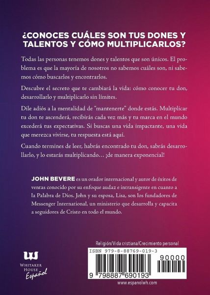"No retengamos nada y muramos vacíos, derramándonos completamente como un regalo para Dios. . . Aquí es cuando realmente volveremos a vivir y experimentaremos la vida al máximo ". - John Bevere ¿Alguna vez te has sentido como un espectador en el reino de Dios? Quizás sabes que hay algo que deberías estar haciendo, pero no puedes identificarlo. La mayoría de nosotros queremos tener un gran impacto en nuestras vidas, pero luchamos con preguntas como: * ¿Cómo puedo estar seguro de que no me estoy perdiendo la voluntad de Dios para mí? * ¿Qué papel juegan mis dones únicos en la construcción del reino de Dios? * ¿Cómo me aseguro de estar a la altura de mi potencial dado por Dios? * ¿Mi llamamiento es menos significativo si no estoy en el "ministerio"? * ¿Cómo equilibro el descanso en la gracia de Dios con acciones significativas para su reino? * ¿Cómo rompo el miedo y sigo adelante incluso cuando se siente incierto y arriesgado? En este libro profundo, el exitoso autor John Bevere se basa en una exploración cuidadosa de las Escrituras y utiliza historias poderosas para ayudarlo a pensar de manera diferente acerca de su llamado y por qué es tan importante para Dios. A medida que pasa estas páginas, tendrá el poder de multiplicar sus dones dados por Dios y aumentar su potencial. Si está listo para cambiar la inacción por un propósito mayor, su viaje comienza aquí. ----- >Do you ever feel like a spectator in God's kingdom? Perhaps you know there's something you should be doing, but you just can't pinpoint it. Most of us want to make a big impact with our lives, but struggle with questions like: * How can I be sure I'm not missing God's will for me? * What role do my unique gifts play in building God's kingdom? * How do I make sure I live up to my God-given potential? * Is my calling less significant if I'm not in ministry? * How do I balance resting in God's grace with meaningful actions for His kingdom? * How do I break fear and move forward even when it feels uncertain and risky? In this profound book, best-selling author John Bevere relies on a careful exploration of Scripture and uses powerful stories to help you think differently about your calling and why it's so important to God. As you turn these pages, you'll be empowered to multiply your God-given gifts and step into your potential. If you're ready to trade inaction for greater purpose, your journey begins here.