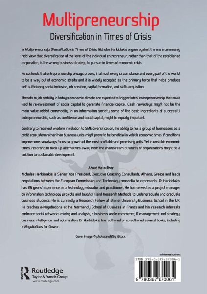 In Multipreneurship: Diversification in Times of Crisis, Nick Harkiolakis argues against the more commonly held view that diversification at the level of the individual entrepreneur, rather than that of the established corporation, is the wrong business strategy to pursue in times of economic crisis. He contends that entrepreneurship always proves, in almost every circumstance and every part of the world, to be a way out of economic straits and it is widely accepted as the primary force that helps produce self-sufficiency, social inclusion, job creation, capital formation, and skills acquisition. Threats to job stability in today's economic climate are expected to trigger latent entrepreneurship that could lead to re-investment of social capital to generate financial capital. Cash nowadays might not be the main value-added commodity. In an information society some of the basic ingredients of successful entrepreneurship, such as confidence and social capital might be equally important. Contrary to received wisdom in relation to SME diversification, the ability to run a group of businesses as a profit ecosystem rather than business units might prove to be beneficial in volatile economic times. If conditions improve one can always focus on growth of the most profitable and promising units. Yet in unstable economic times, resorting to back-up alternatives away from the mainstream business of organizations might be a solution to sustainable development.