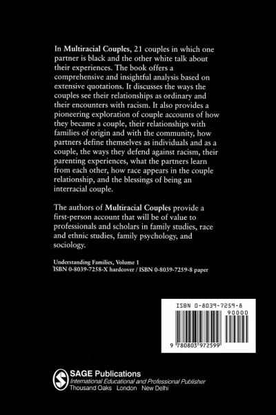The problems of mixed race families in a racist society are fully explored in this qualitative, narrative study. Interviews with 21 biracial couples offer deep insights into their relationships and how they perceive society has viewed their marriages. The interviewers, a biracial couple themselves, ask their subjects such questions as how their churches, families, friends and community treat them and their partners. They also examine the interactions between spouses in biracial marriages and relationships between these couples and their parents and children.