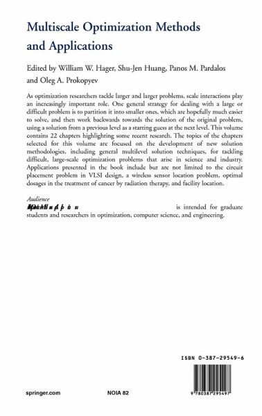 As optimization researchers tackle larger and larger problems, scale interactions play an increasingly important role. One general strategy for dealing with a large or difficult problem is to partition it into smaller ones, which are hopefully much easier to solve, and then work backwards towards the solution of original problem, using a solution from a previous level as a starting guess at the next level. This volume contains 22 chapters highlighting some recent research. The topics of the chapters selected for this volume are focused on the development of new solution methodologies,…mehr