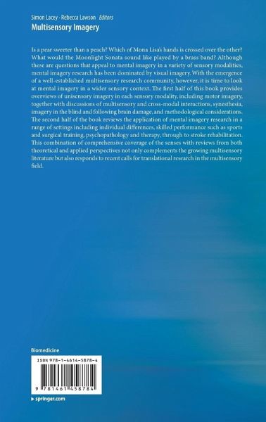 Is a pear sweeter than a peach? Which of Mona Lisa's hands is crossed over the other? What would the Moonlight Sonata sound like played by a brass band? Although these are questions that appeal to mental imagery in a variety of sensory modalities, mental imagery research has been dominated by visual imagery. With the emergence of a well-established multisensory research community, however, it is time to look at mental imagery in a wider sensory context. Part I of this book provides overviews of unisensory imagery in each sensory modality, including motor imagery, together with discussions of multisensory and cross-modal interactions, synesthesia, imagery in the blind and following brain damage, and methodological considerations. Part II reviews the application of mental imagery research in a range of settings including individual differences, skilled performance such as sports and surgical training, psychopathology and therapy, through to stroke rehabilitation. This combination of comprehensive coverage of the senses with reviews from both theoretical and applied perspectives not only complements the growing multisensory literature but also responds to recent calls for translational research in the multisensory field.