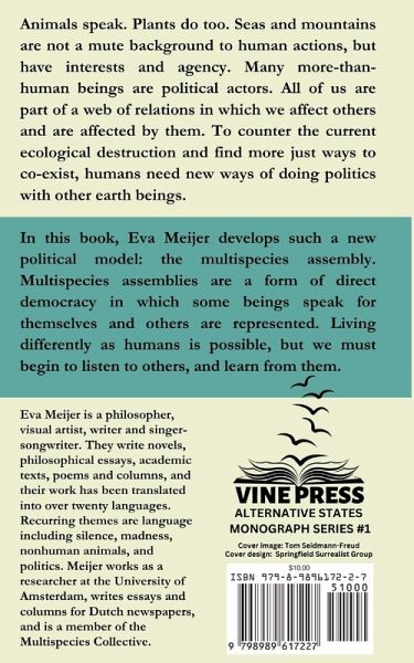 Animals speak. Plants do too. Seas and mountains are not a mute background to human actions, but have interests and agency. Many more-than-human beings are political actors. All of us are part of a web of relations in which we affect others and are affected by them. To counter the current ecological destruction and find more just ways to co-exist, humans need new ways of doing politics with other earth beings. In this book, Dutch philosopher Eva Meijer develops such a new political model: the multispecies assembly. Multispecies assemblies are a form of direct democracy in which some beings speak for themselves and others are represented. Living differently as humans is possible, but we must begin to listen to others, and learn from them.