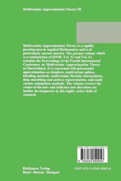 Zur Tagung.- List of Participants.- Program of the Sessions.- L. Bamberger: Interpolation in bivariate spline spaces.- n-th order polynomial spline blending.- The limits of multivariate cardinal splines.- Local smoothing for scattered and noisy data.- Convexity and variation diminishing property of Bernstein polynomials over triangles.- The dimensions of bivariate spline spaces over triangulations.- On bivariate vertex splines.- Biorthogonal system of polynomials on the standard simplex.- Anwendung der Approximationstheorie auf gewisse singulare Randwertaufgaben.- Combinatorial aspects of multivariate splines.- Intermediate blending interpolation.- Hermite-interpolation in N variables and minimal cubature formulae.- Some reflections on multi-dimensional Euler and Poisson summation formulas.- On the dimension of the spline space S 21(D) in special cases.- Degree of best approximation by blending functions.- Shape preserving approximation by polyhedral splines.- Numerical realization of boundary collocation methods.- Interpolation by polynomials and natural splines on normal lattices.- Bivariate approximation procedures.- Construction and applications of Hermite interpolating quadratic spline functions of two and three variables.- Hermite-Fejér and higher Hermite-Fejér interpolation with boundary conditions.- Some uniqueness problems in best Chebyshev and mean multivariate approximation.- Minimal projections in tensor product spaces.- Convergence of Hermite-Fejér interpolation via Korovkin's theorem.- Cubature error bounds using degrees of approximation.- Square functions in the theory of Cesaro summability of double orthogonal series.- Generalized Melkes interpolation.- Approximation theory and analysis of spectral methods.- On multivariate polynomialL1-approximation to zero and related coefficient inequalities.- Abschatzungen von Lagrange-Quadratsummen für die Sphäre mit Hilfe gewisser Eigenwerte.- On Gabor information cells.- Ein Beitrag zur Flachenapproximation über unregelmäßig vertei lten Daten.- The basis and moment problems of some systems of analytic functions.- Normen von Projektionen in mehreren Veranderlichen.- The solution of generalized least squares problems.