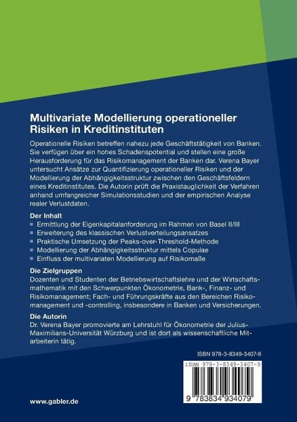 Operationelle Risiken betreffen nahezu jede Geschäftstätigkeit von Banken. Sie verfügen über ein hohes Schadenspotential und stellen eine große Herausforderung für das Risikomanagement der Banken dar. Verena Bayer untersucht Ansätze zur Quantifizierung operationeller Risiken und der Modellierung der Abhängigkeitsstruktur zwischen den Geschäftsfeldern eines Kreditinstitutes. Die Autorin prüft die Praxistauglichkeit der Verfahren anhand umfangreicher Simulationsstudien und der empirischen Analyse realer Verlustdaten.