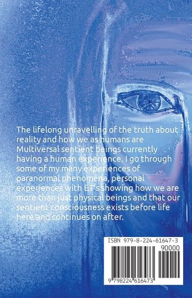 The lifelong unravelling of the truth about reality and how we as humans are Multiversal sentient beings currently having a human experience. I go through some of my many experiences of paranormal phenomena, personal experiences with ET's showing how we are more than just physical beings and that our sentient consciousness exists before life here and continues on after.