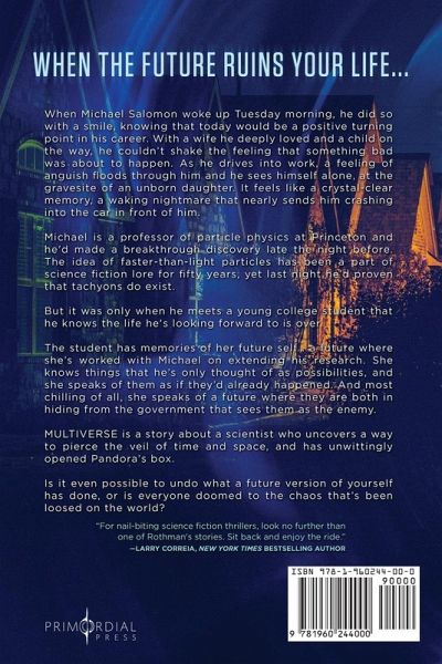 "Fast-paced prose, fit-for-Hollywood characterizations, science with a wow factor, and accessible descriptions of complex quantum concepts and experiments... hard science meets pop-science time-travel in this entertaining thriller." - Kirkus Reviews When the future ruins your life... From a USA Today bestselling author: After particle physics professor Michael discovers how to pierce time and space, he meets a student who has memories of her future - and the research they have yet to complete together... "You won't be disappointed" (New York Times bestselling author Kevin J. Anderson). ------ When Michael Salomon woke up Tuesday morning, he did so with a smile, knowing that today would be a positive turning point in his career. With his first child on the way, he couldn't shake the feeling that something bad was about to happen. As he drives into work, he feels a sudden wave of anguish wash over him, and he sees himself alone, at the gravesite of an unborn daughter. It feels like a crystal-clear memory, a waking nightmare that nearly sends him crashing into the car in front of him. The idea of faster-than-light particles has been a part of science fiction lore for fifty years, yet Michael had made a breakthrough discovery late last night. Tachyons do exist. Going back into the office, he hasn't even had a chance to tell anyone about what he's discovered when the men from DARPA came calling. The entirety of his research has suddenly become an object of national security. But it was only when a young college student intercepts him as he gets into his car that he knows the life he's looking forward to is over. The student has memories of her future self... a future where she's worked with Michael on extending his research. She knows things that he's only thought of as possibilities, and she speaks of them as if they'd already happened. And most chilling of all, she speaks of a future where they are both in hiding from the government that sees them as the enemy. MULTIVERSE is a story about a scientist who uncovers a way to pierce the veil of time and space, and has unwittingly opened Pandora's box. Is it even possible to undo what a future version of yourself has done, or is everyone doomed to the chaos that's been loosed on the world?